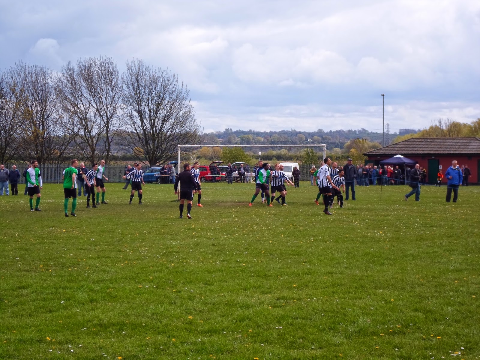 Next stop was a nine mile trip to Victoria Park in Netherfield, found just on the A612 opposite the retail park. The ground has the changing rooms at the entrance with a refreshment hatch at the back. The ground is basically two football fields full of dandelions and daisies with the nearer pitch roped off. As the home side wear black ‘n’ white striped shirts I bought one for £3, having some really good crack with the big lad selling the hot drinks and the fellow selling the souvenirs & programmes.