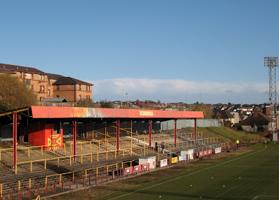 Cliftonhill opened on 25th December 1919. The Main Stand sits high on a rise above the aptly named Main Street. The stand was built in the same year as their only Scottish Cup Final appearance and this along with the front paddock is the only part of the stadium now used on matchdays. The stand has 489 red and yellow wooden flip seats with the peak roof having a flat extension over the standing area which was added in 1994. The club shop and refreshment bar are found underneath the stand.