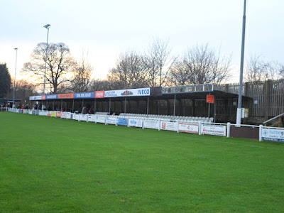 Main amenities behind the goal next to the turnstile entrance, with the players changing rooms set further back in a separate building. The main stand is three-quarters pitch length split between terracing and two rows of white flip seats. Opposite are the team dugouts with the rest of the ground made up of open hard standing, with additional new terracing in the top corner beside the stand.