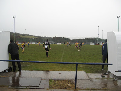 The clubhouse (where I had time for another bevvy and read of the programme before kick-off) and changing rooms are at the top end of the ground beside the main car park. The other three sides are open with hard standing and there are two floodlight poles at each side.
