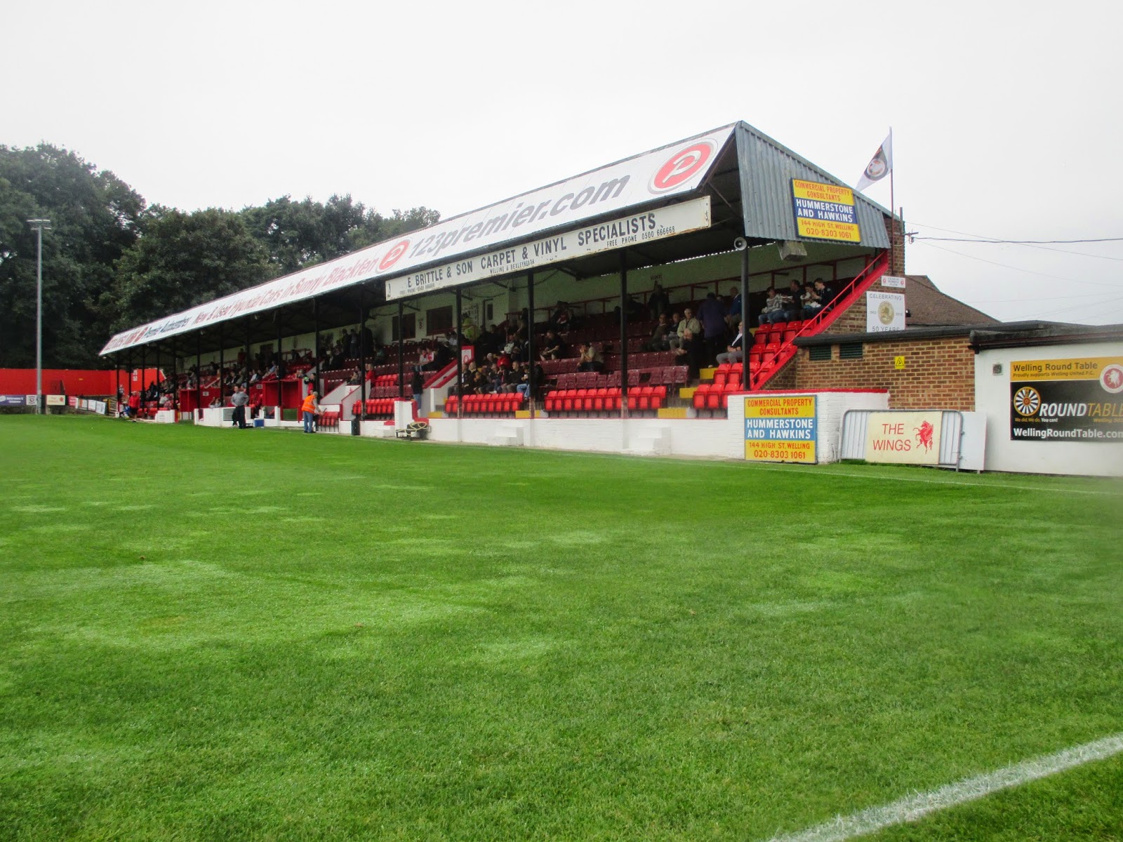 The ground is quite unique as it appears as two grounds in one, due to the share arrangement with Erith and Belvedere FC. The original Main Stand opened in 1950, runs two-thirds pitch length after it was extended in the 1960s. The stand is small but quite steep, with a peaked roof, supporting pillars and filled with 570 red and burgundy flip seats. There and red wooden dugouts at the front and behind the stand is the club reception, Wings Sports Bar, clubhouse and refreshment bar. There is terracing behind each goal with red crash barriers at the High Street end, but nothing to lean on at the Danson Park End, with both terracing coming around to meet the stands.